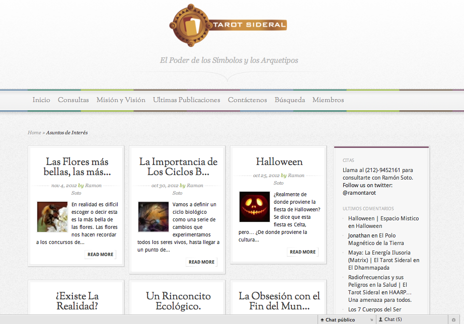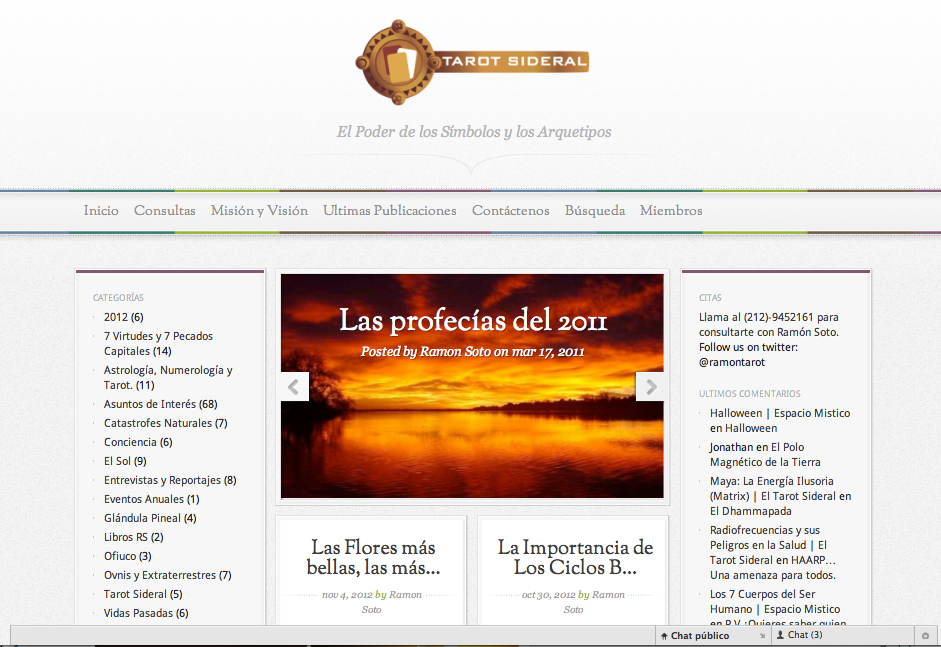 El Tarot Sideral Website Websites Client: El Tarot Sideral. Project: Webpage Re-Design www.eltarotsideral.com Page updated with Jonathan Soto Gregg as Webmaster (www.sotogregg.com) Caracas Vzla. 2010 Website Home: Website Categorie: Skills Posted on October 7, 2010 ← Fairchild Garden | Daisies Red Book of Provita 1997 →