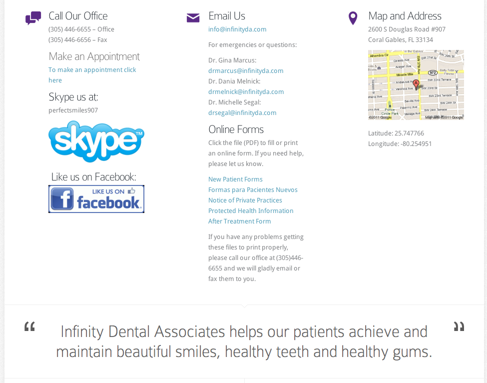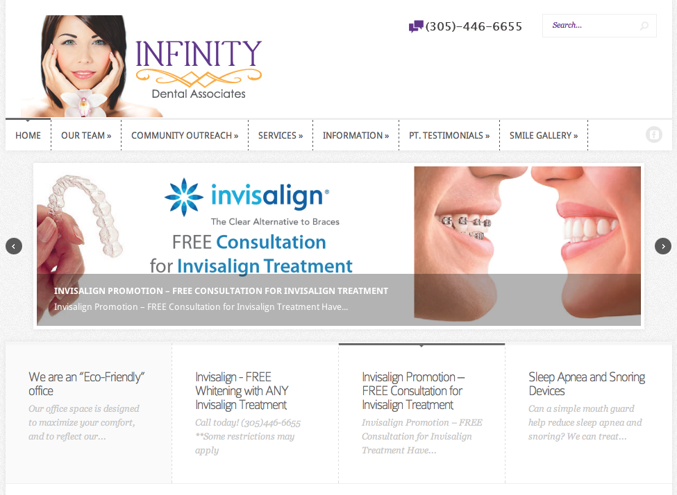 Infinity Dental Associates Website Websites Client: Infinity Dental Associates Gina Marcus DMD Project: Webpage upgrade www.infinityda.com Page updated with Jonathan Soto Gregg as Webmaster (www.sotogregg.com) USA Miami Fl. 2013 Home Page : Skills Posted on May 3, 2013 ← Infinity Dental Associates Buchito Racing 5 →